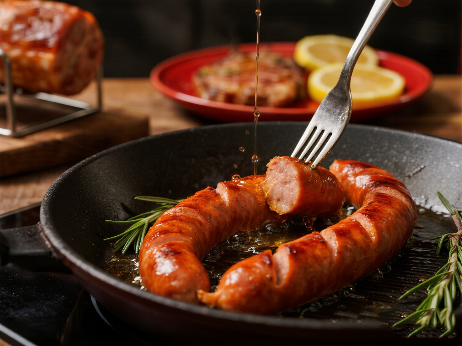 ①冷鍋刷油,放入香腸,兩面煎至焦黃,加入少許水,蓋上鍋蓋水煎,小火慢煎8分鐘左右,直至熟透 → ②香腸切段擠上檸檬汁,開(kāi)吃!