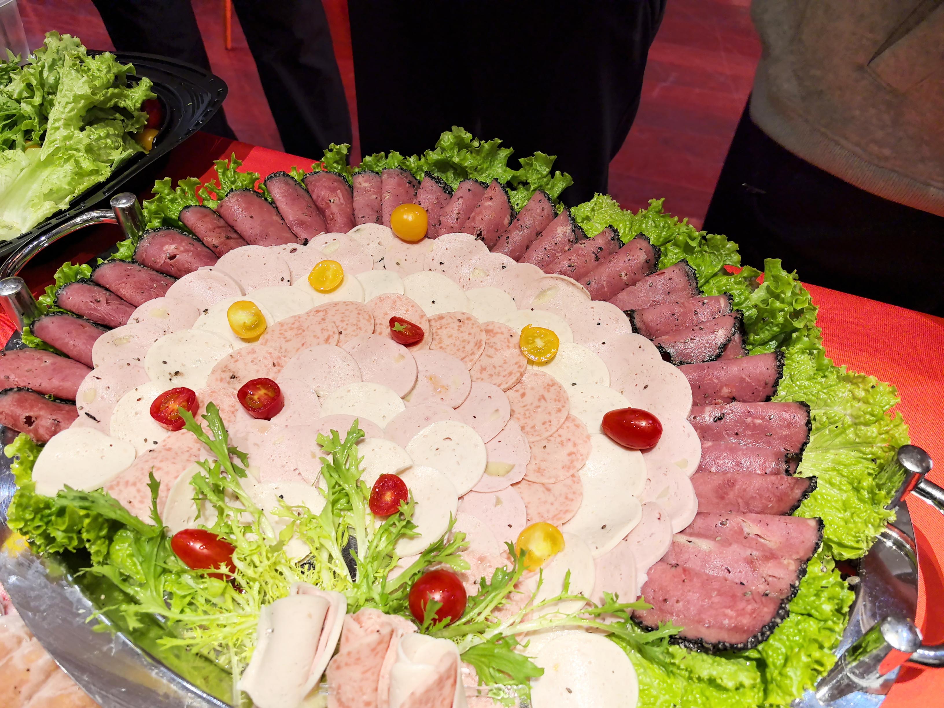 精心準(zhǔn)備的精制培根切片拼盤,肉質(zhì)鮮嫩,咸香適口;德式香腸拼盤更是誠意滿滿,瑞士雞肉烤腸的鮮嫩、圖林根香腸的醇厚、德式香蔥油煎盤腸的鮮香、小牛腸的細(xì)膩,每一款都讓人回味無窮;冷切拼盤里,蘑菇里昂那的獨(dú)特風(fēng)味、黑椒牛肉切片的緊實(shí)口感、雞肉冷切腸的 Q 彈,滿足了不同嘉賓的味蕾偏好;還有經(jīng)典的德式脆皮豬肘,外皮酥脆,內(nèi)里肉質(zhì)軟爛多汁,一上桌就吸引了眾人目光,贏得陣陣好評!