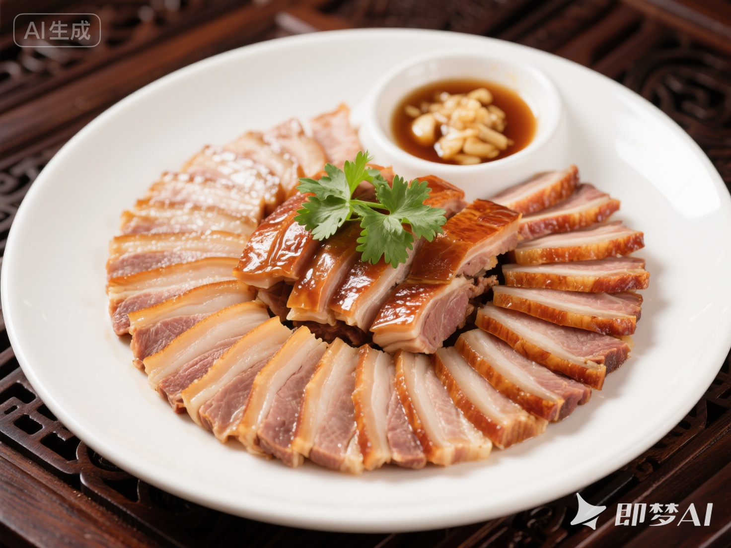 ② 定型與切片: 將熱好的豬肘取出,稍晾至不燙手。用保鮮膜將其緊緊卷成圓柱形,放入冰箱冷藏定型1-2小時(shí)。定型后取出,撕去保鮮膜,逆著肌肉紋理切成均勻的厚片,擺入盤中;